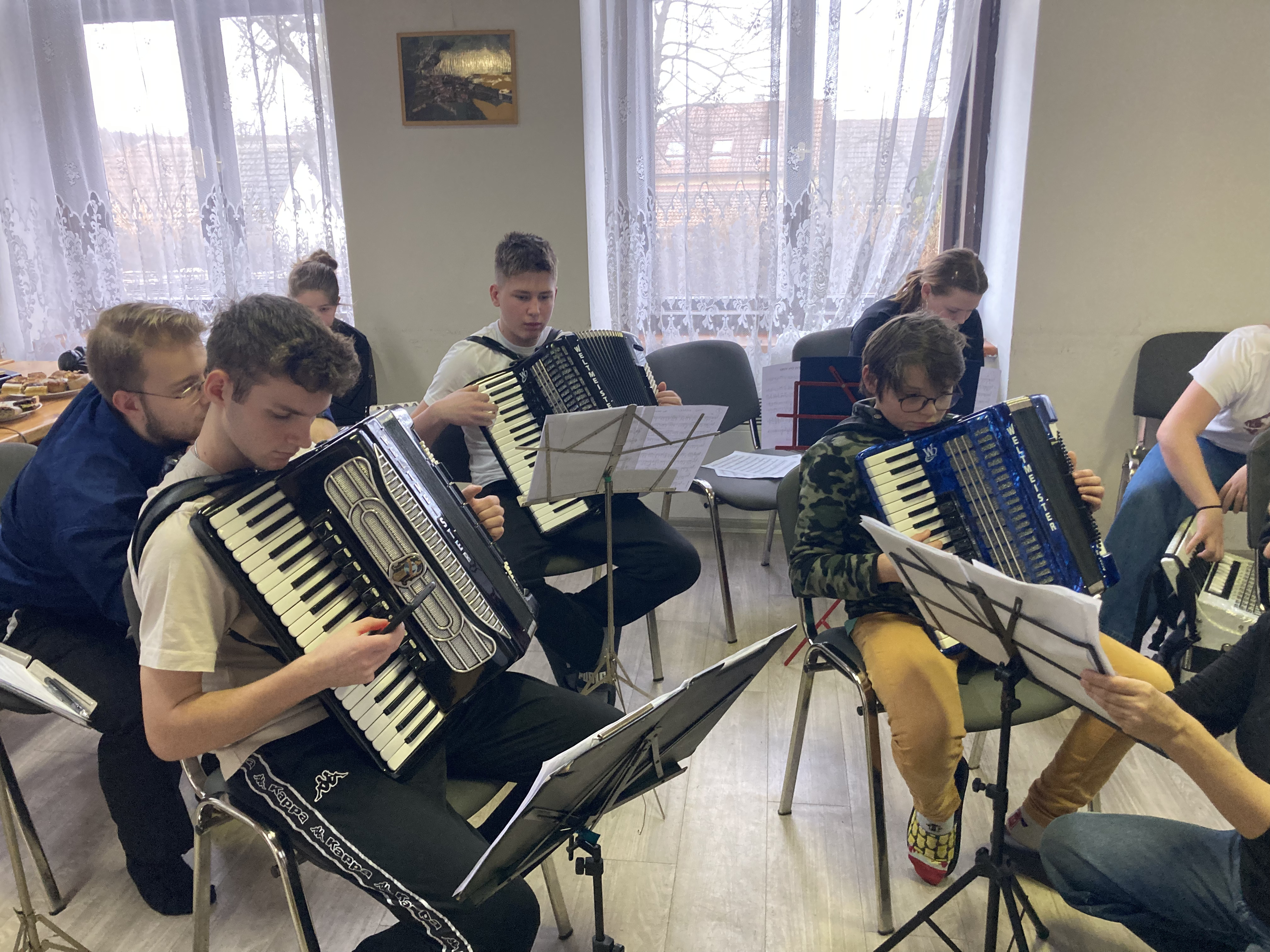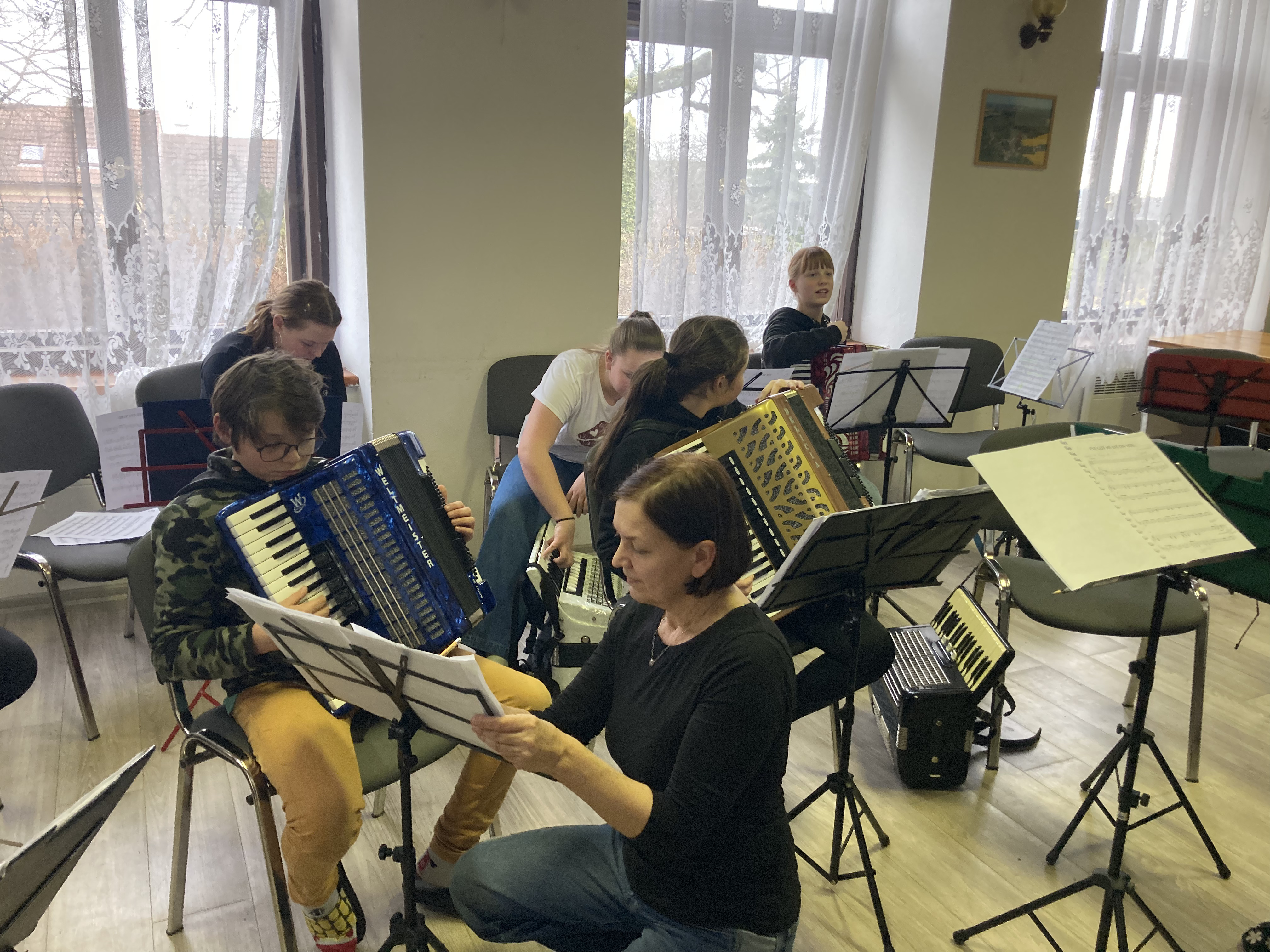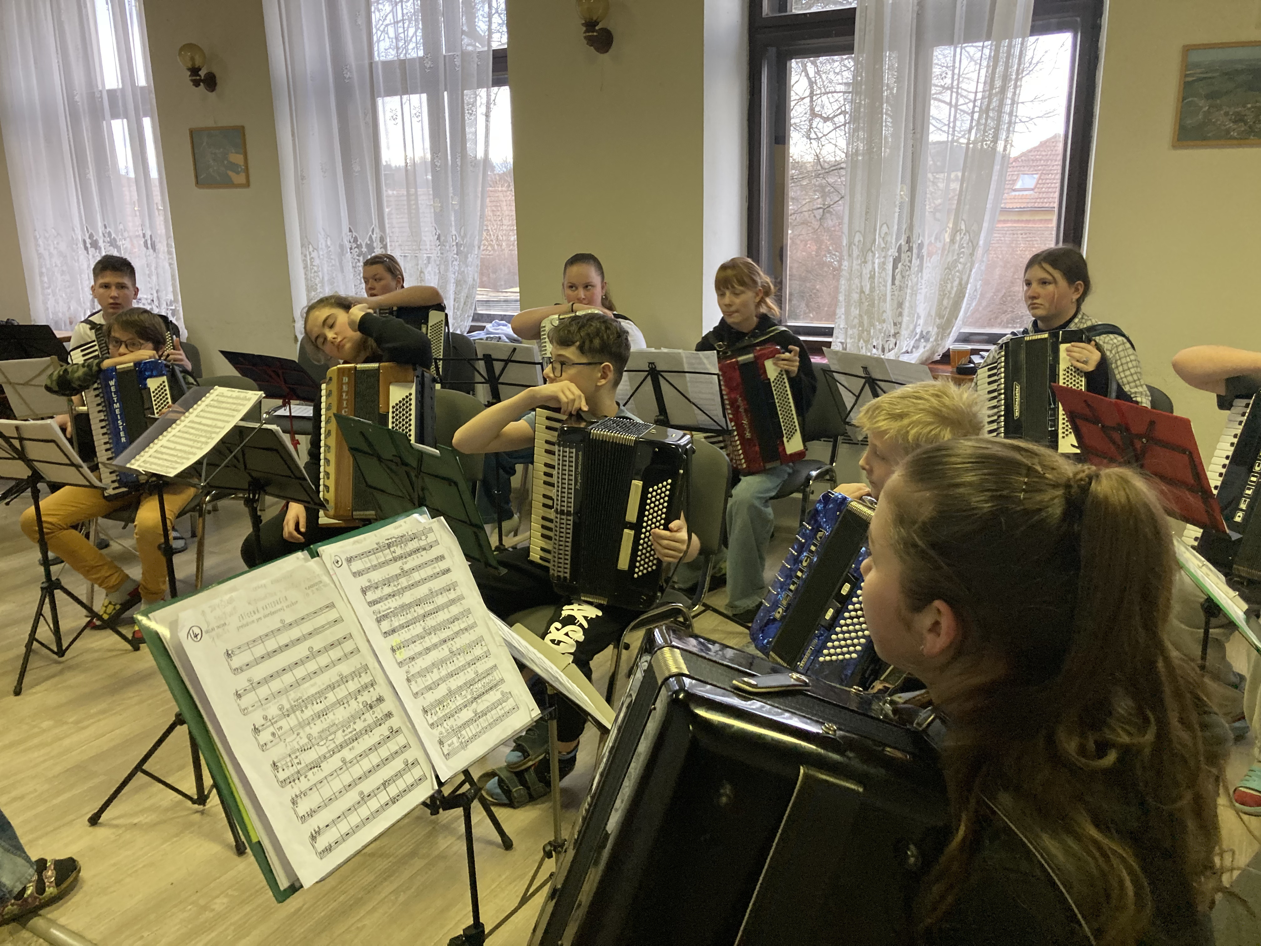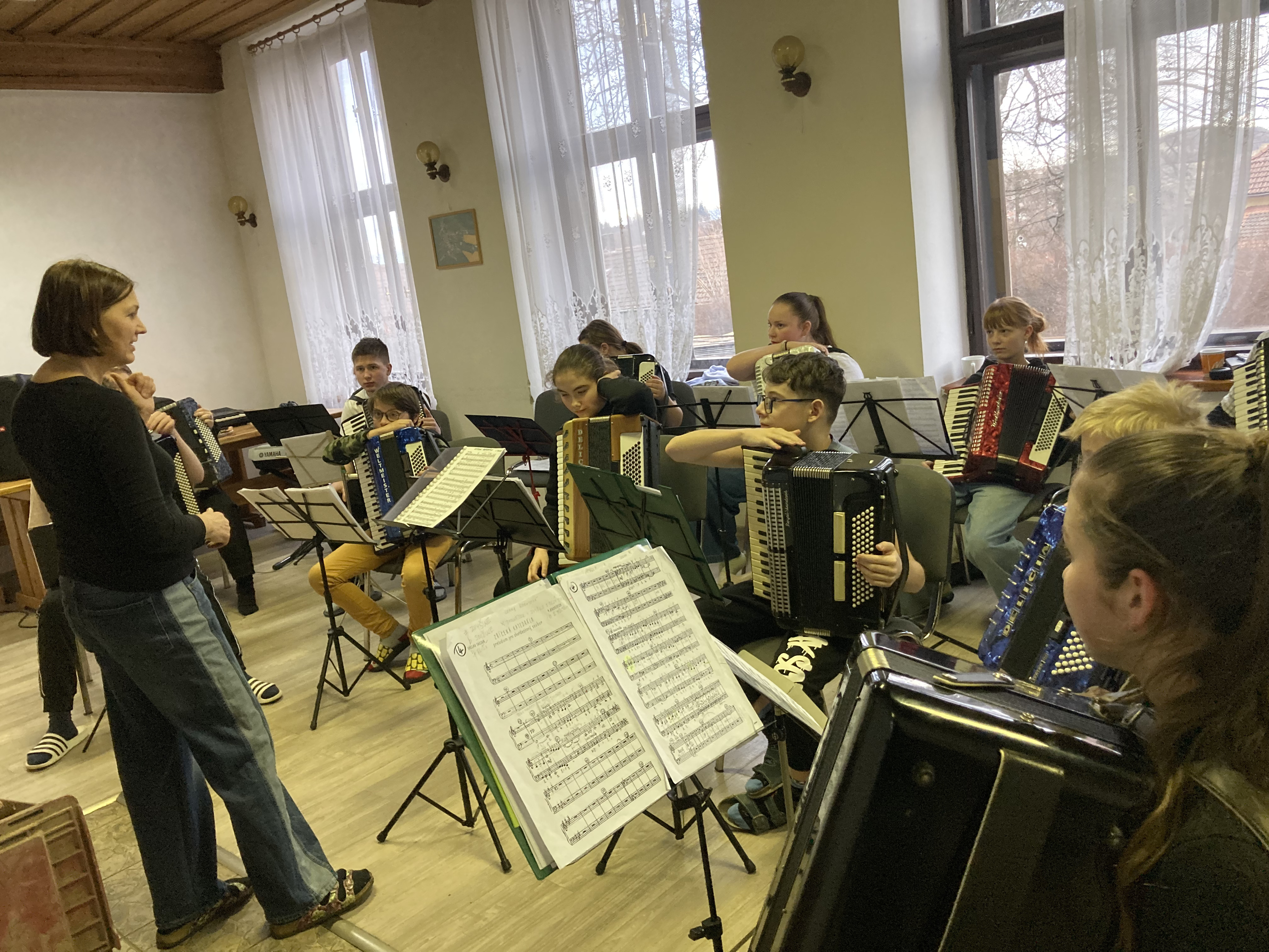 Ve dnech 12. a 13. února 2026 proběhlo tradiční soustředění akordeonového oddělení ZUŠ Třešť a Telč v Penzionu Dyje v Panenské Rozsíčce. I letos jsme na dva dny „přestěhovali“ naše žáky i jejich nástroje, abychom se mohli naplno věnovat přípravě na vyšší kola soutěže MŠMT ve hře na akordeon i na tradiční koncert „Čaj o páté“, který se uskutečnil 5. března 2026 v 17:00 v Domě s pečovatelskou službou v Telči. Program soustředění byl jako vždy velmi pestrý a intenzivní. Žáci se během dvou dnů věnovali orchestrální hře, přípravě Měchbandu na soutěžní vystoupení i sólovému a komornímu repertoáru. Čekalo je společné muzicírování, dolaďování detailů i soustředěná práce na jednotlivých skladbách. Přestože šlo o pracovní setkání naplněné cvičením, nechyběla ani tradiční, která posílila přátelskou atmosféru celého soustředění. O žáky se staraly paní učitelky Jitka Svobodová a Veronika Krejčířová. Pro Veroniku Krejčířovou bylo letošní soustředění premiérou v roli učitelky. Před svým studiem na konzervatoři a následným působením v zahraničí se těchto soustředění řadu let účastnila jako žačka bývalé paní ředitelky Meister, po níž nyní převzala výuku hry na akordeon. Velké poděkování patřilo maminkám za výborné domácí dobroty, rodičům za pomoc s převozem těžkých nástrojů a také Unii rodičů při ZUŠ Třešť, která dětem hradila první noc ubytování. Díky všem mělo naše společné muzicírování nejen pracovní, ale i krásně přátelský rozměr.