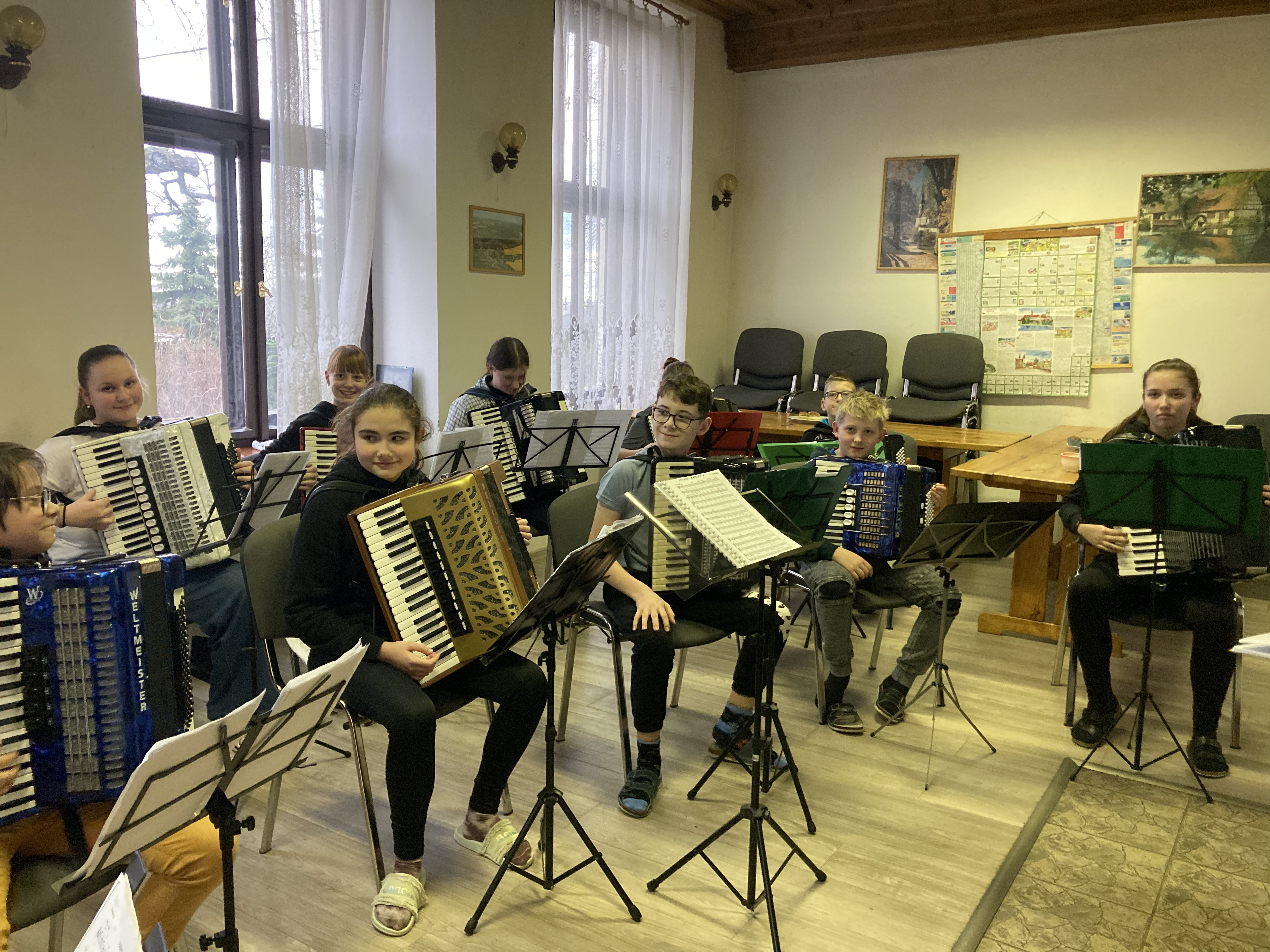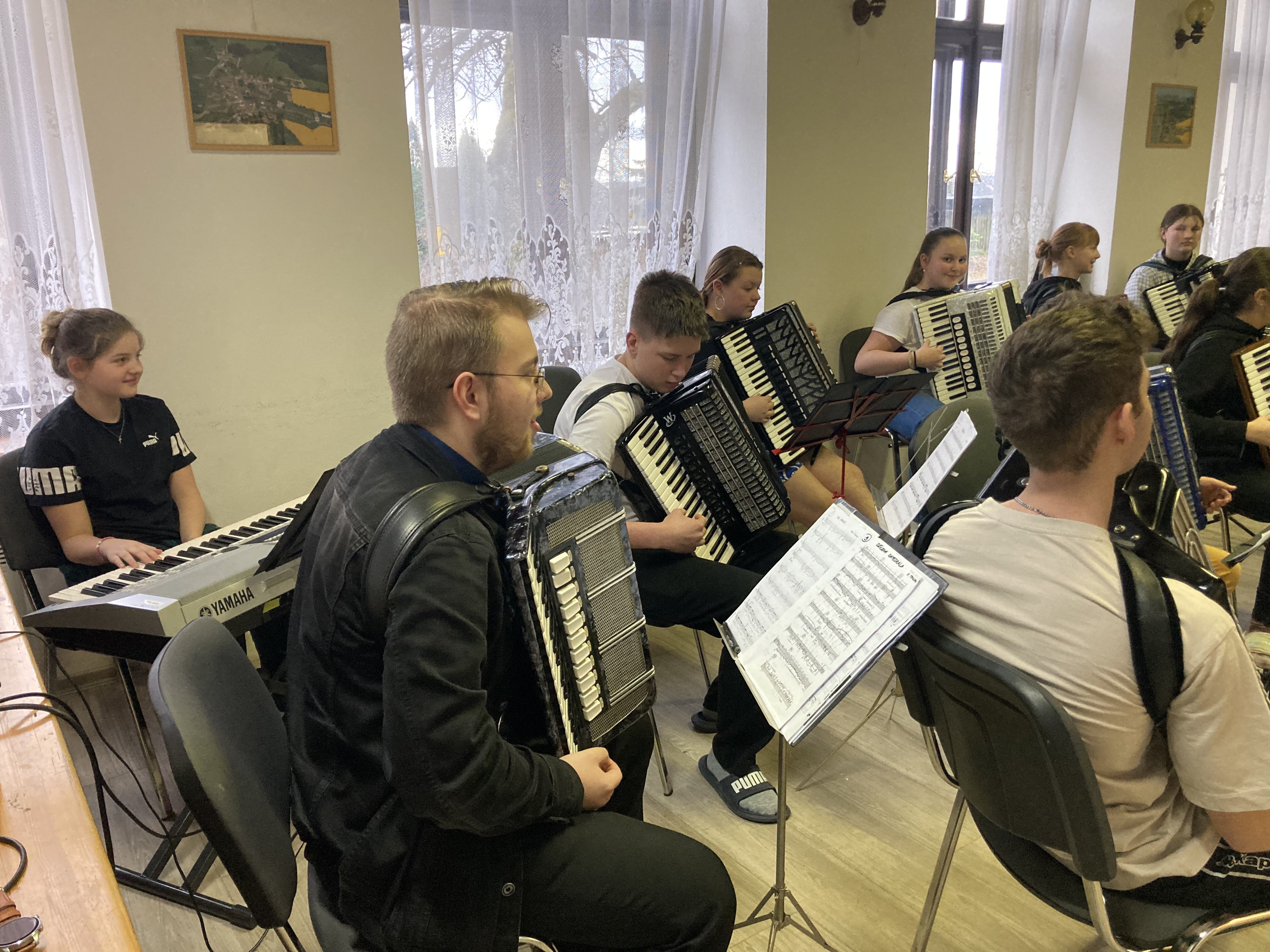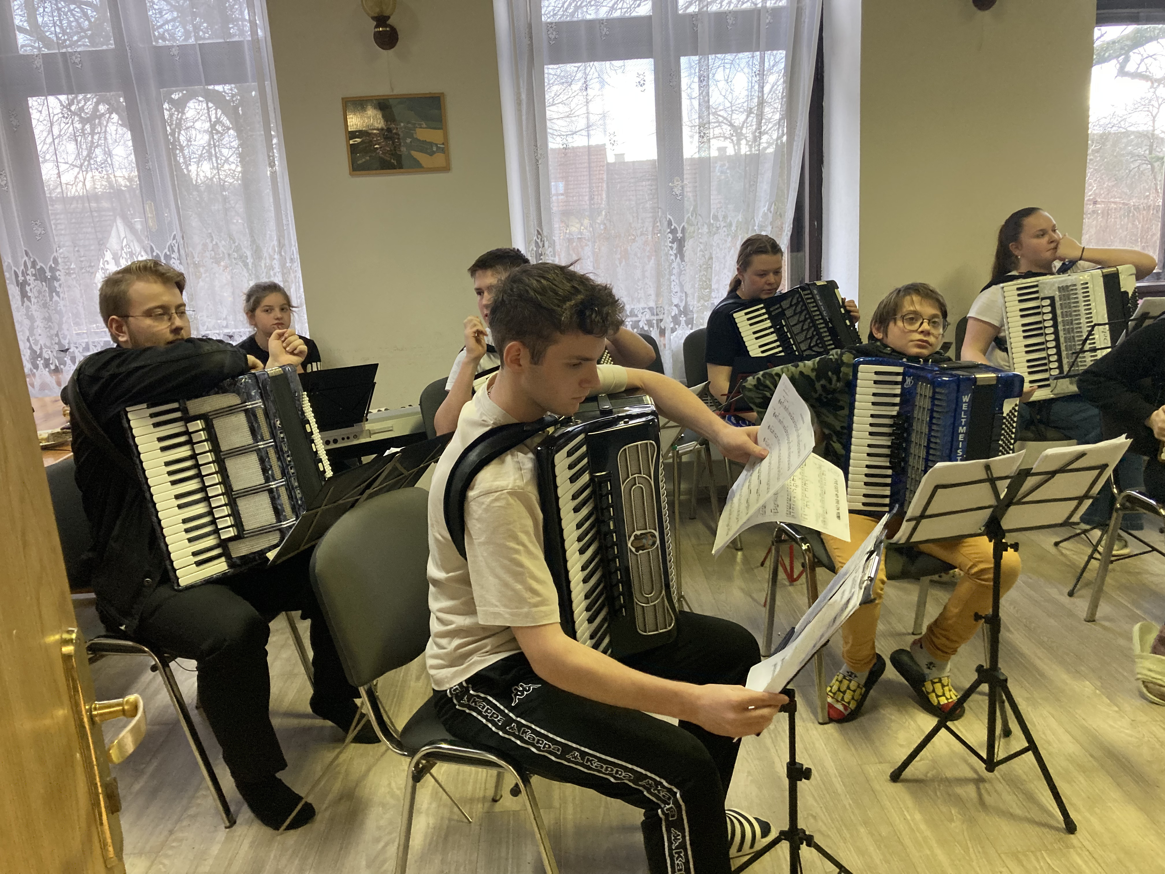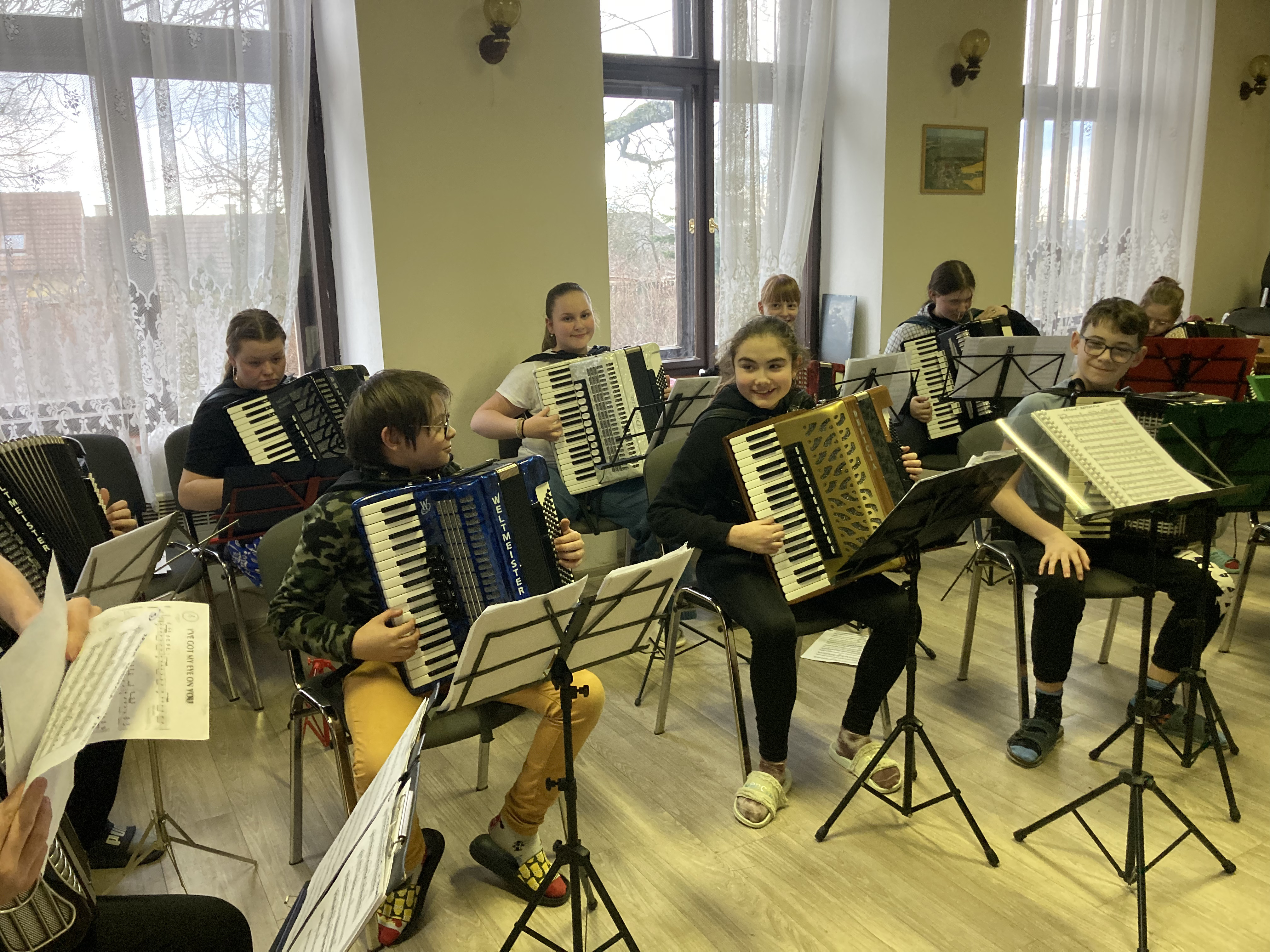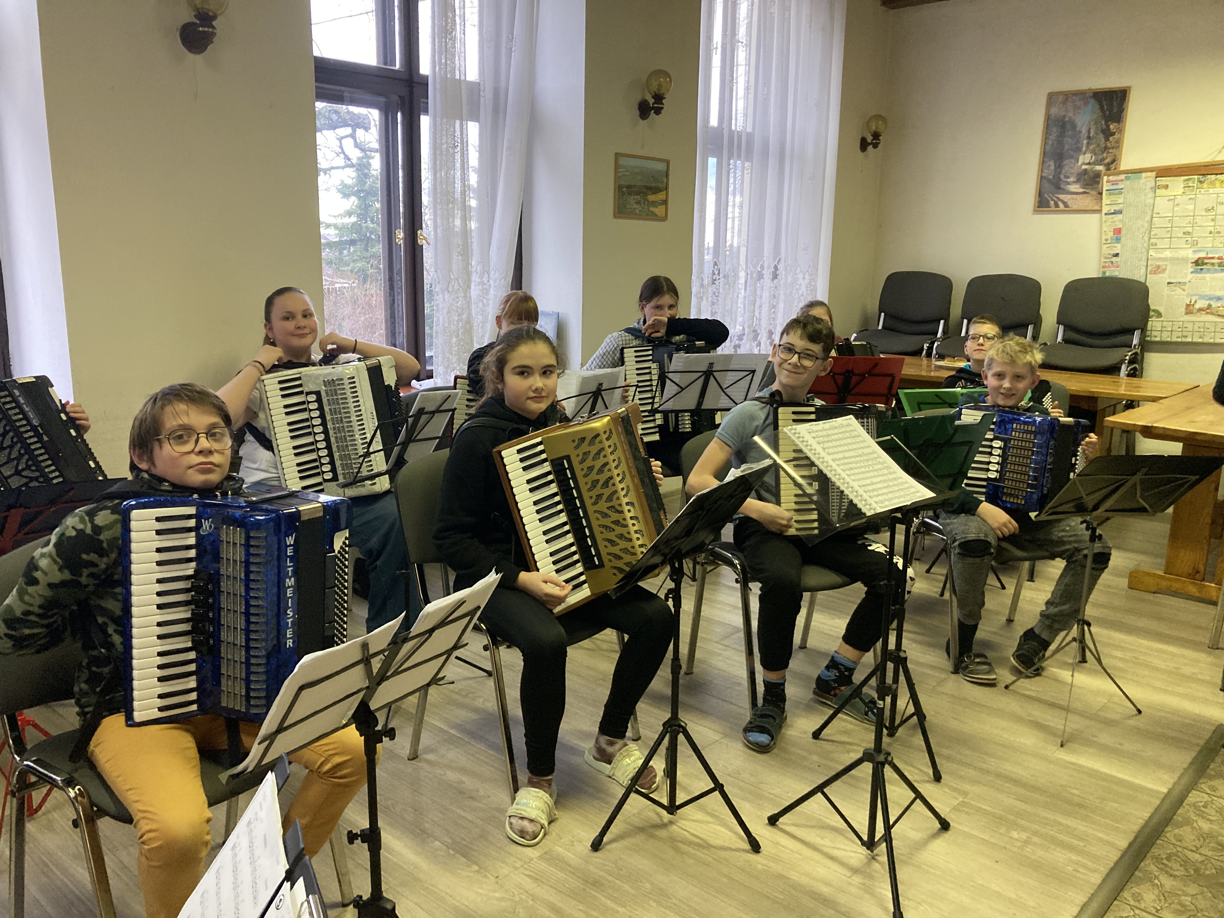 Ve dnech 12. a 13. února 2026 proběhlo tradiční soustředění akordeonového oddělení ZUŠ Třešť a Telč v Penzionu Dyje v Panenské Rozsíčce. I letos jsme na dva dny „přestěhovali“ naše žáky i jejich nástroje, abychom se mohli naplno věnovat přípravě na vyšší kola soutěže MŠMT ve hře na akordeon i na tradiční koncert „Čaj o páté“, který se uskutečnil 5. března 2026 v 17:00 v Domě s pečovatelskou službou v Telči. Program soustředění byl jako vždy velmi pestrý a intenzivní. Žáci se během dvou dnů věnovali orchestrální hře, přípravě Měchbandu na soutěžní vystoupení i sólovému a komornímu repertoáru. Čekalo je společné muzicírování, dolaďování detailů i soustředěná práce na jednotlivých skladbách. Přestože šlo o pracovní setkání naplněné cvičením, nechyběla ani tradiční, která posílila přátelskou atmosféru celého soustředění. O žáky se staraly paní učitelky Jitka Svobodová a Veronika Krejčířová. Pro Veroniku Krejčířovou bylo letošní soustředění premiérou v roli učitelky. Před svým studiem na konzervatoři a následným působením v zahraničí se těchto soustředění řadu let účastnila jako žačka bývalé paní ředitelky Meister, po níž nyní převzala výuku hry na akordeon. Velké poděkování patřilo maminkám za výborné domácí dobroty, rodičům za pomoc s převozem těžkých nástrojů a také Unii rodičů při ZUŠ Třešť, která dětem hradila první noc ubytování. Díky všem mělo naše společné muzicírování nejen pracovní, ale i krásně přátelský rozměr.